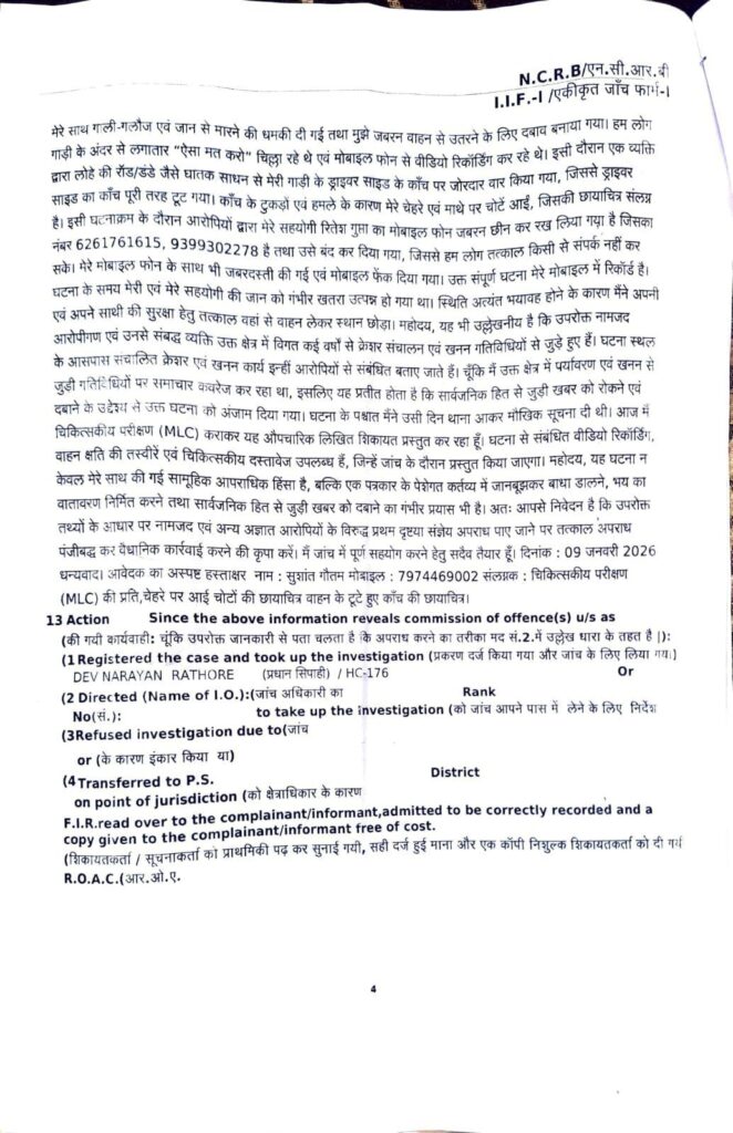 लोहे की रॉड से हमला, गाड़ियों के शीशे टूटे, पत्रकार का चेहरा लहूलुहान कर दिया गया। साक्ष्य मिटाने के इरादे से मोबाइल फोन भी लूट लिया गया। यह हमला किसी व्यक्ति पर नहीं, बल्कि उस कैमरे और कलम पर था, जो माफिया की अवैध तिजोरियों का राज खोल रहा था।