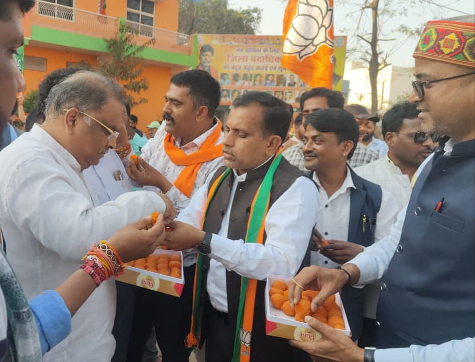 भाजपा कार्यालय में जोरदार आतिशबाजी व ढोल नगाड़े के साथ मनायी खुशियाँ, बांटी मिठाईयाँ