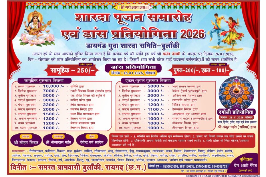ग्राम बुलाकी में 26 जनवरी की रात्रि होगा शारदा पूजन एवं डांस प्रतियोगिता का भव्य आयोजनJanuary 23, 2026January 23, 2026छत्तीसगढ़