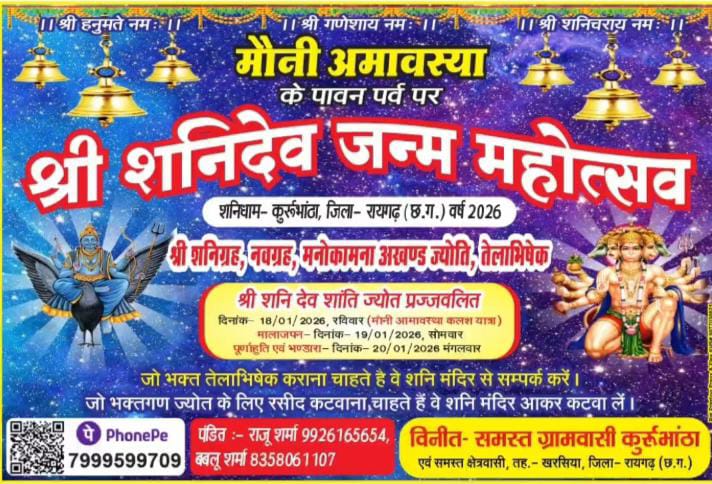कुरुंभांठा में श्री शनिदेव जन्म महोत्सव का भव्य आयोजन, क्षेत्र भर के श्रद्धालु होंगे शामिलJanuary 17, 2026छत्तीसगढ़, रायगढ़