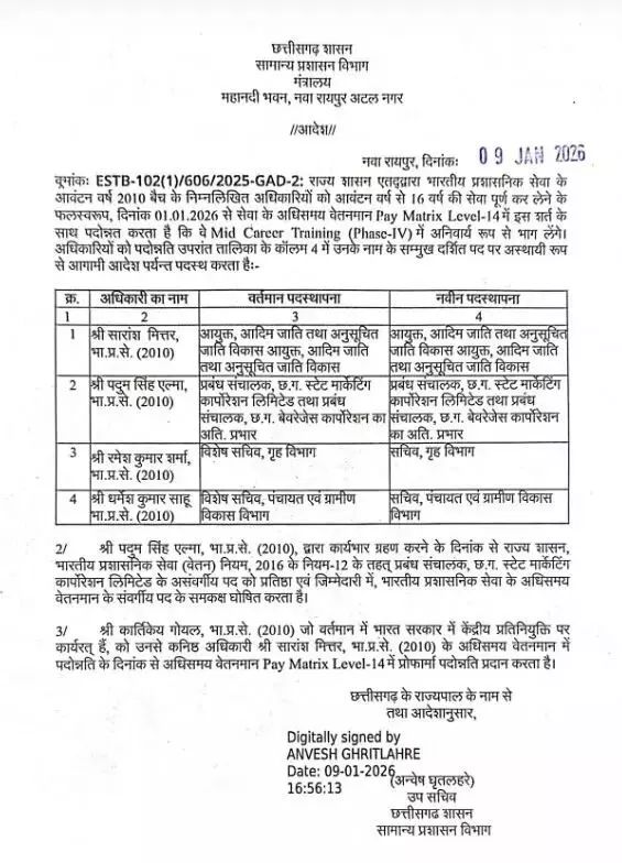 सूची में 2010 बैच के अफसर सारांश मित्तर, पदुम सिंह एल्मा, रमेश कुमार शर्मा और धर्मेश कुमार साहू हैं। इन अफसरों को 16 वर्ष की सेवा पूर्ण कर लेने पर पदोन्नत किया गया हैं।