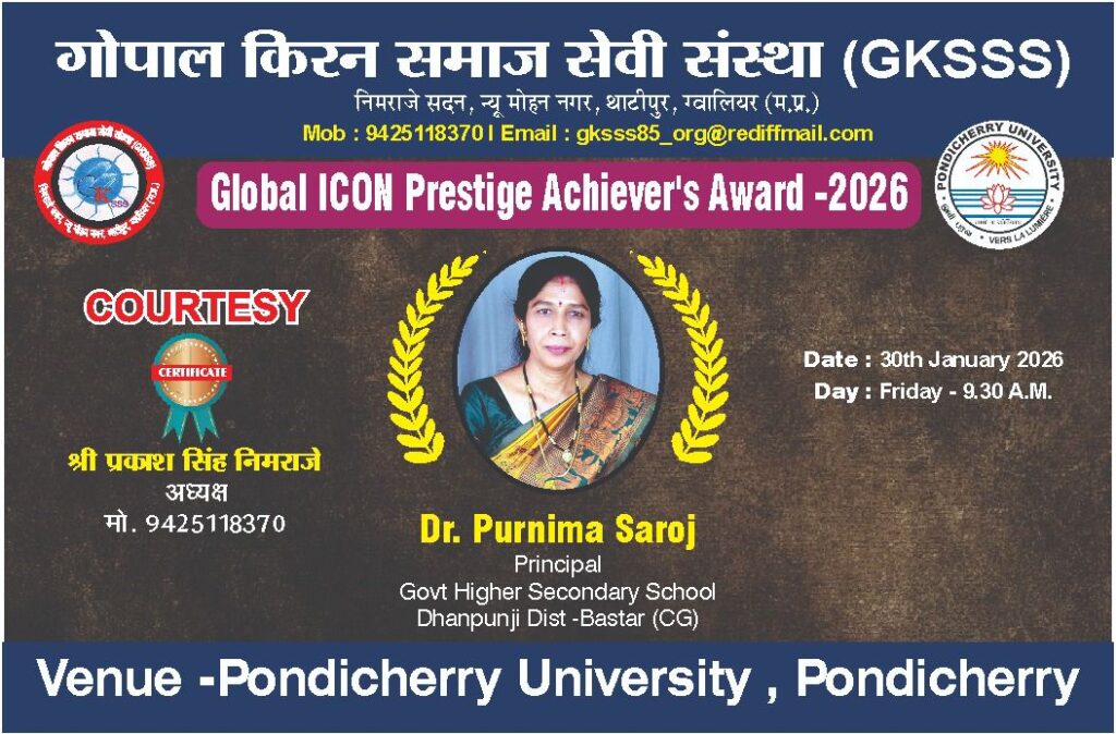 30जनवरी 2026 को पांडिचेरी विश्वविद्यालय पांडिचेरी में आयोजित इस भव्य राष्ट्रीय संगोष्ठी एवम् सम्मान समारोह के कार्यक्रम में छत्तीसगढ़ के बस्तर जिले से डॉ.पूर्णिमा सरोज को शिक्षा में नवाचार, शोध,साहित्य , संस्कृति तथा विभिन्न सामाजिक कार्यों में सक्रिय योगदान हेतु पांडिचेरी विश्वविद्यालय एवं गोपाल किरण समाजसेवी संस्था के द्वारा डॉ.पूर्णिमा सरोज को ग्लोबल आइकन प्रेस्टीज अचीवर्स अवॉर्ड का सम्मान प्रदान किया गया।