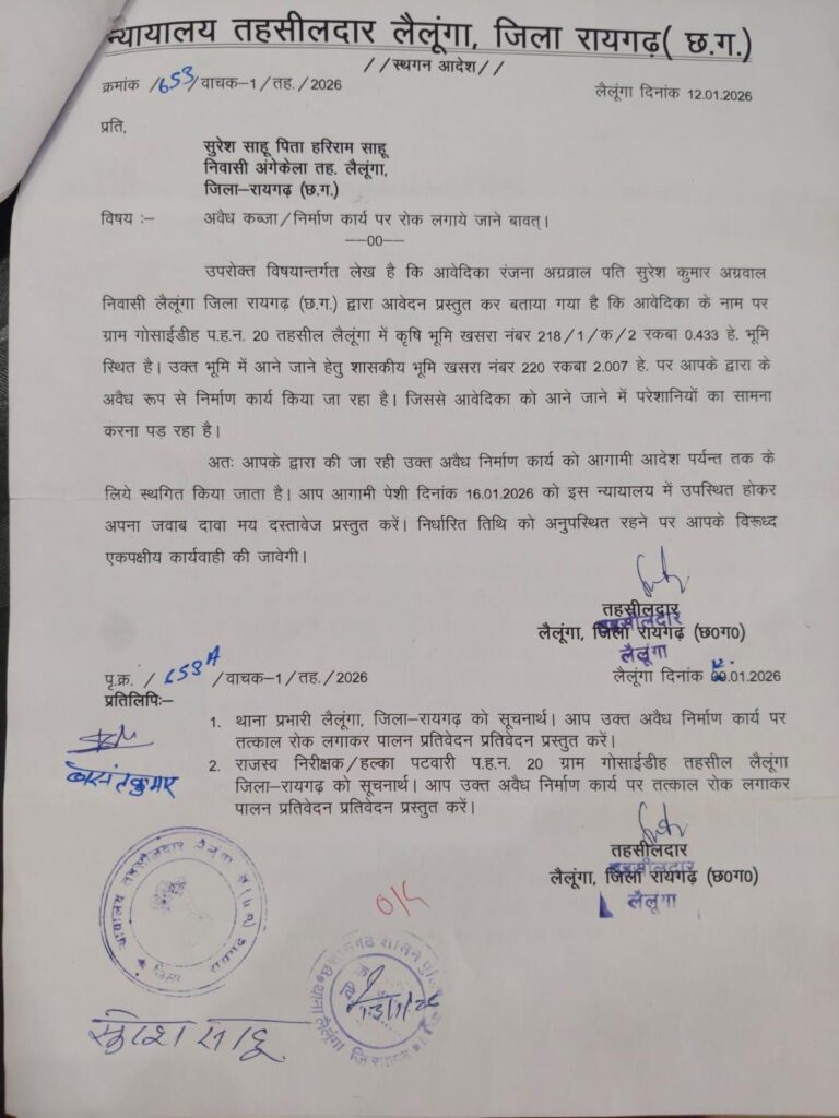 लैलूंगा – तहसील अंतर्गत ग्राम गोसाईडीह में शासकीय भूमि पर हो रहे अवैध निर्माण का मामला लगातार गंभीर होता जा रहा है। इस प्रकरण में न्यायालय तहसीलदार लैलूंगा (सक्षम व्यवहार न्यायालय) द्वारा दिनांक 12.01.2026 को प्रकरण क्रमांक 653/वाचक-1/तह./2026 में अवैध निर्माण पर स्थगन आदेश जारी किया गया था, लेकिन इसके बावजूद आदेश की अवहेलना और प्रशासनिक उदासीनता की बातें सामने आ रही हैं।