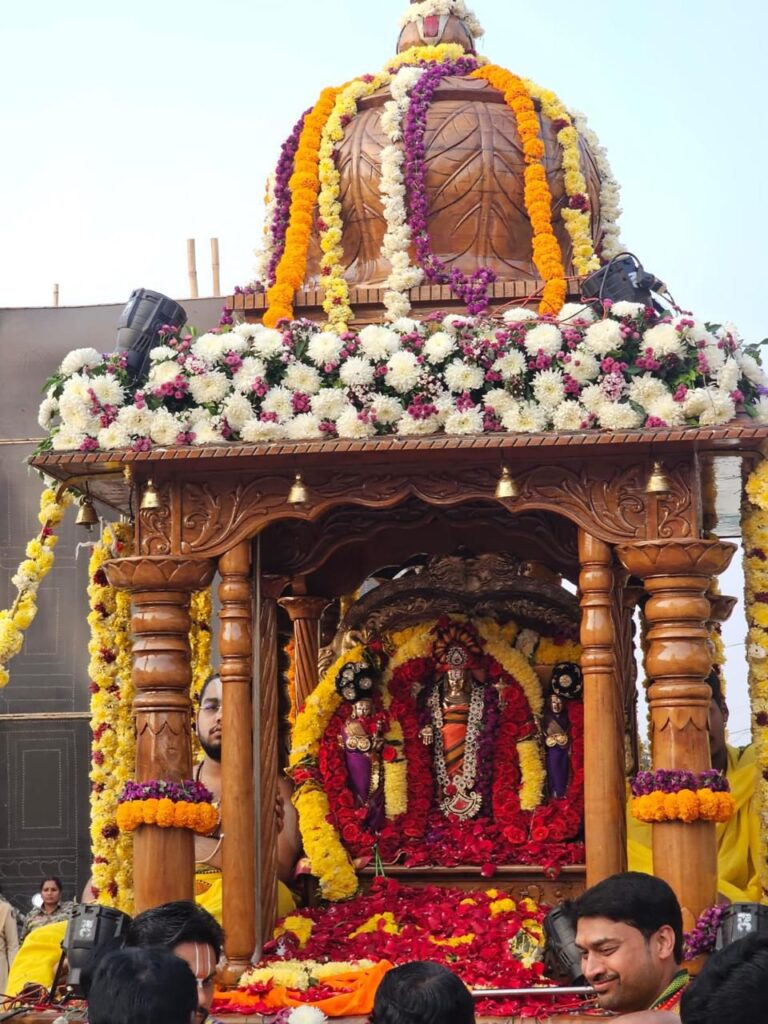 जगदलपुर। बालाजी मंदिर के 25वें वार्षिक महोत्सव के दूसरे दिन भगवान वेंकटेश्वर स्वामी जी की भव्य शोभायात्रा निकाली गई। शोभायात्रा में काष्ठ निर्मित रथ पर भगवान बालाजी, माता आंडाल एवं माता पद्मावती की उत्सव मूर्तियों को रथारूढ़ कर हजारों की संख्या में उपस्थित भक्तों ने नगर भ्रमण किया। शोभायात्रा में महिलाएं मिट्टी और पीतल के कलश लेकर चल रहे थे।