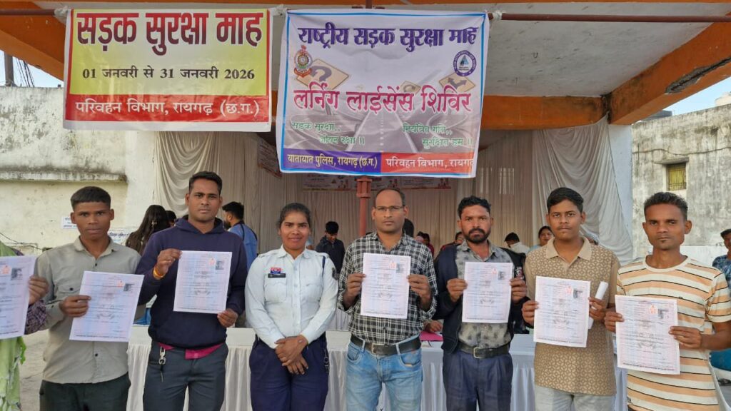 रायगढ़ ।  राष्ट्रीय सड़क सुरक्षा माह 2026 के अंतर्गत सड़क सुरक्षा एवं यातायात नियमों के प्रति जागरूकता बढ़ाने के उद्देश्य से  दिनांक 13 जनवरी 2026  को रायगढ़ में लर्निंग लाइसेंस शिविर का सफल आयोजन किया गया।