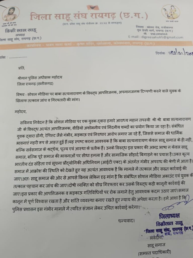 जिला साहू संघ रायगढ़ के जिला अध्यक्ष डिग्री लाल साहू के नेतृत्व में समाज के पदाधिकारियों ने पुलिस अधीक्षक कार्यालय पहुंचकर ज्ञापन सौंपा। ज्ञापन में बताया गया कि सोशल मीडिया पर एक युवक द्वारा बाबा सत्यनारायण के विरुद्ध अत्यंत आपत्तिजनक, अपमानजनक और भड़काऊ शब्दों का प्रयोग किया गया है।