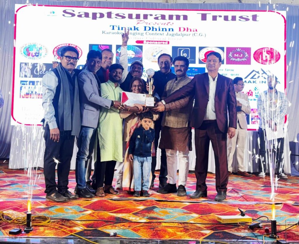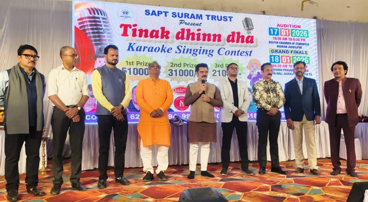 जगदलपुर— सप्त सुरम ट्रस्ट द्वारा आयोजित “तिनक धिन धा कराओके सिंगिंग कॉन्टेस्ट” का ग्रैंड फिनाले रविवार को श्यामा प्रसाद मुखर्जी टाउन हॉल, जगदलपुर में भव्य रूप से संपन्न हुआ। प्रतियोगिता के ऑडिशन बस्तर चेंबर ऑफ कॉमर्स में आयोजित किए गए थे, जिसमें कुल 120 प्रतिभागियों ने भाग लिया। इनमें से 25 प्रतिभागियों का चयन ग्रैंड फिनाले के लिए किया गया।